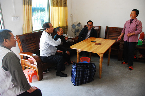 随后梁主席一行又来到贫困户刘德付、陈神妹家走访。70多岁的刘德付老人是重点扶贫对象,两年前他一家三口与一笼鸡住在一间低矮的土胚房内,屋内光线暗、臭气难闻。扶贫工作组听取区政协建议,当即行动用石灰粉刷消毒小屋,并拆走砖砌的鸡笼,实现了人禽分居。在区政协、扶贫工作组和村党支部的共同努力下,去年刘德付家终于迁入新居。这次来访,梁主席对刘德付的身体状况、孩子的学习情况及生产生活条件的改善表示满意,当看到通往楼顶平台的台阶还没有装护栏时,梁主席当即指示工作组的同志尽快为刘德付装好护栏,保障安全。