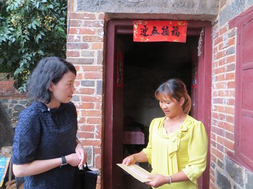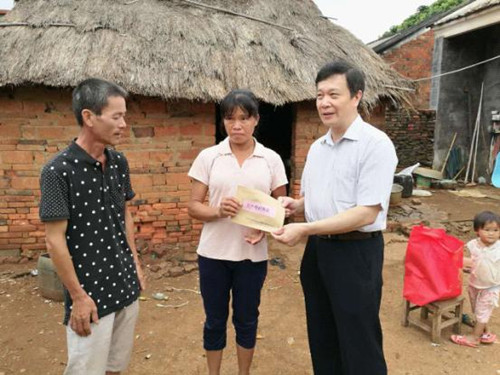 图为郭祺副主席(左三)到贫困户郑南君家中慰问,并向其妻子陈金莲(右一)送上生产帮扶资金。