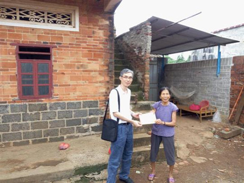 图为谭振东副主席(左)到挂扶贫困户吴耀家中进行慰问,向吴耀老母亲郑连玉送上生产帮扶资金,嘱咐老人家要保重身体。