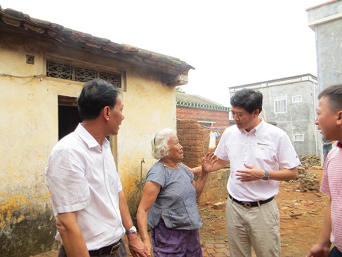 图为陈仲贤秘书长(右二)了解贫困户郑才母亲孙景荣(左二)的生活情况。 |