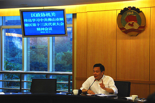 中共佛山市顺德区第十三次代表大会刚结束,10月11日下午,区政协机关就马上召开学习会,学报告、谈体会,结合政协职能,部署下阶段区政协工作。区政协党组书记、主席周文主持会议,郭祺副主席、李梓文副主席、谭振东副主席、专职常委、办公室正副主任等机关工作人员参加了学习会。