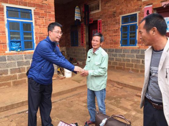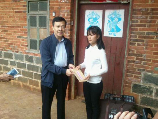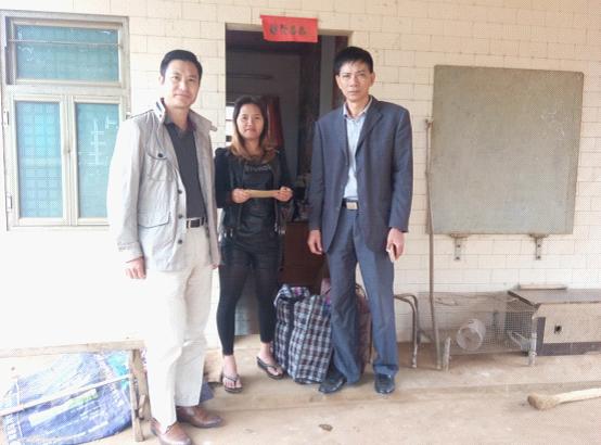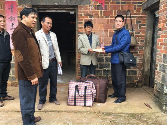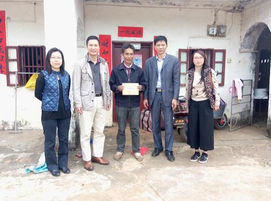 何鸿佳秘书长(左一)为贫困户郑才(中)送上慰问品和生产帮扶资金,郑才紧紧握住何鸿佳秘书长的手表示感谢, |