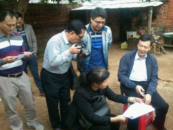 在贫困户林招家中,周文主席与徐闻县副主席、扶贫办主任陈振珠(右三)共同研究对林招家的帮扶措施,并送上慰问品和生产帮扶资金。
