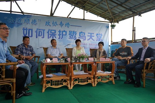 在伦教的鹭鸟天堂内,冼铨辉用脚手架搭建了两座观鸟台。它们最初作为“放哨”之用,如今成了爱鸟之人的瞭望台。而“论道顺德”政协论坛走进这里,在一片苍苍郁郁、鹭鸟飞翔之中,探讨这片绿地的保育问题。