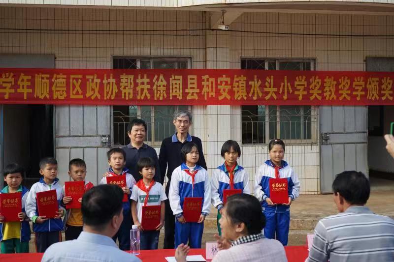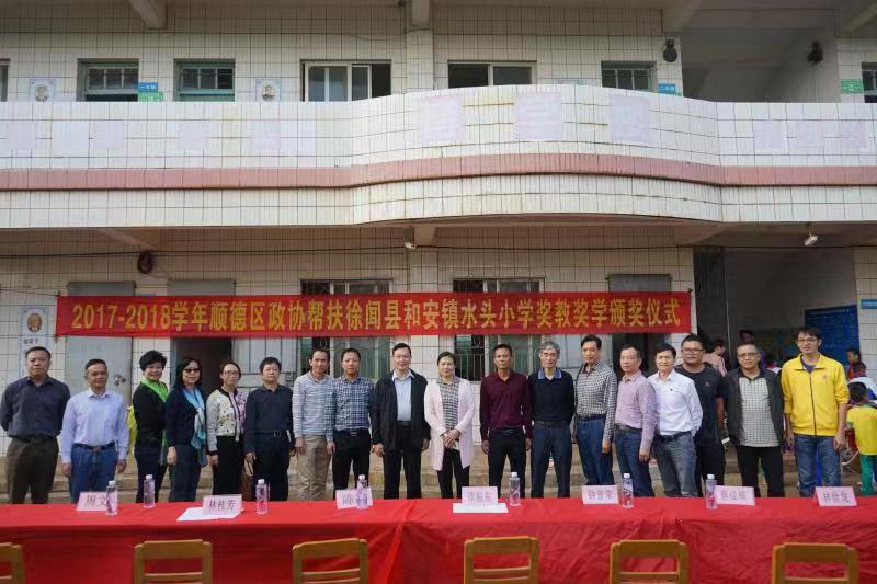 当天下午,在水头小学举行了2017-2018学年顺德区政协帮扶徐闻县和安镇水头小学奖教奖学颁奖仪式,水头小学校长陈孟、和安镇镇长邱之放依次在颁奖仪式会上发言,表达了对顺德区政协支持水头小学教育发展的感谢。按照《徐闻县和安镇水头小学奖教奖学协会章程草案》和《关于顺德精准扶贫捐赠专项资金的使用计划书》,对评选出的7名统考抽考三等奖、优秀班主任奖、优秀教师奖获得者,以及78名学习成绩进步奖、学习成绩一、二、三等奖的获奖学生进行了颁奖,奖项的设立对促进学校的长远发展和学生的健康成长起到了积极作用。
