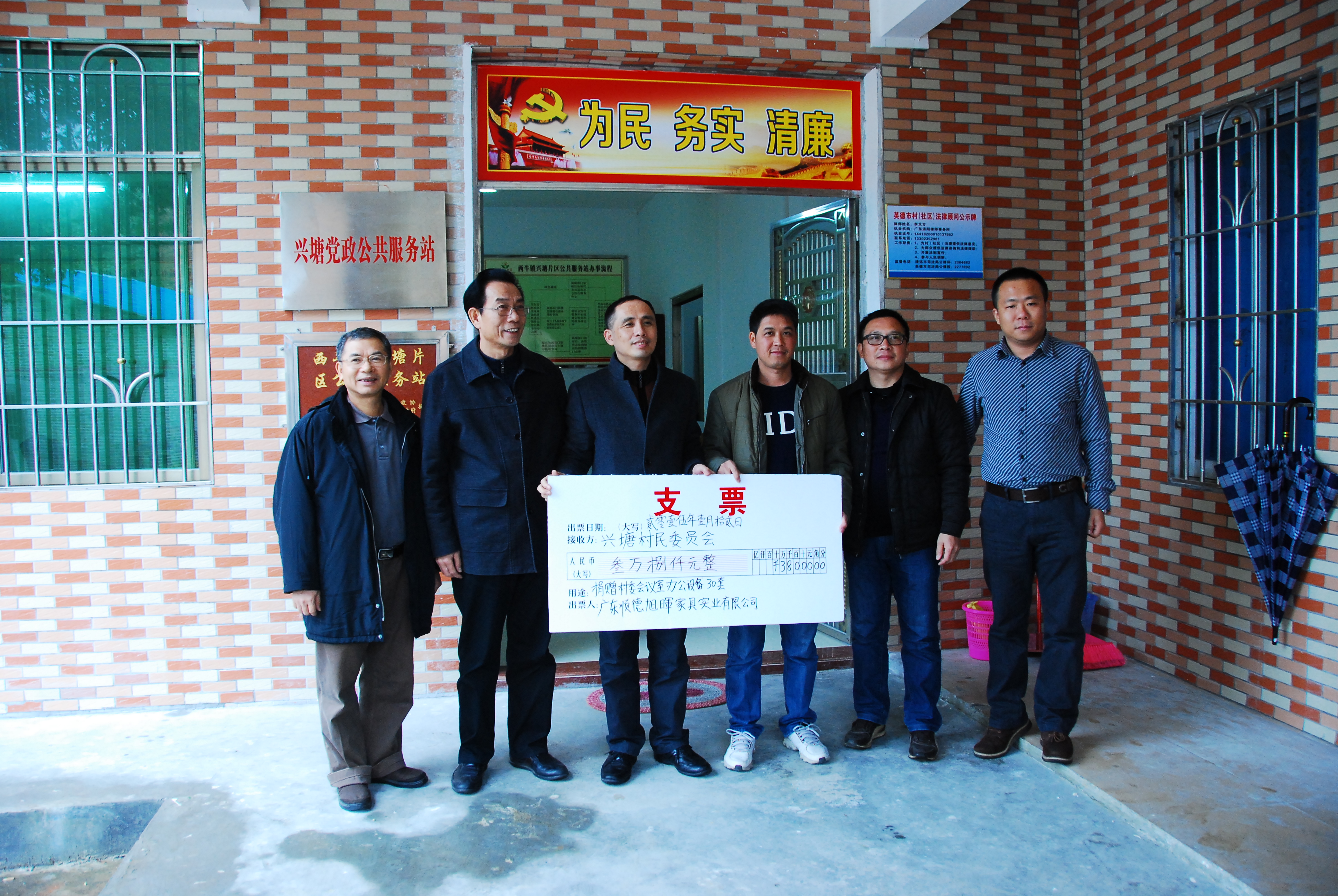 去年11月,兴塘村在顺德区政协、乐从镇政府及各方帮助下,建成了新的行政服务大楼,但新楼建成了,里面除了几张破旧的桌椅板凳,基本上没有什么办公家具,使行政服务效率大打折扣,影响了工作的开展。2014年11月25日,梁国章主席来到兴塘村指导扶贫“双到”工作时,了解到这一情况,看在眼里,急在心里,总觉得好事还没有完全办好,想方设法为兴塘村行政服务站改善办公条件。在梁主席的关注下,区政协充分发挥自身优势,经与委员企业——顺德旭晖家具公司衔接协调,得到了公司董事长、政协委员马旭聪先生的积极响应和大力支持,该公司将价值3.8万元的办公家具捐赠给了兴塘村,使兴塘行政服务站的办公条件得到了显著改善。